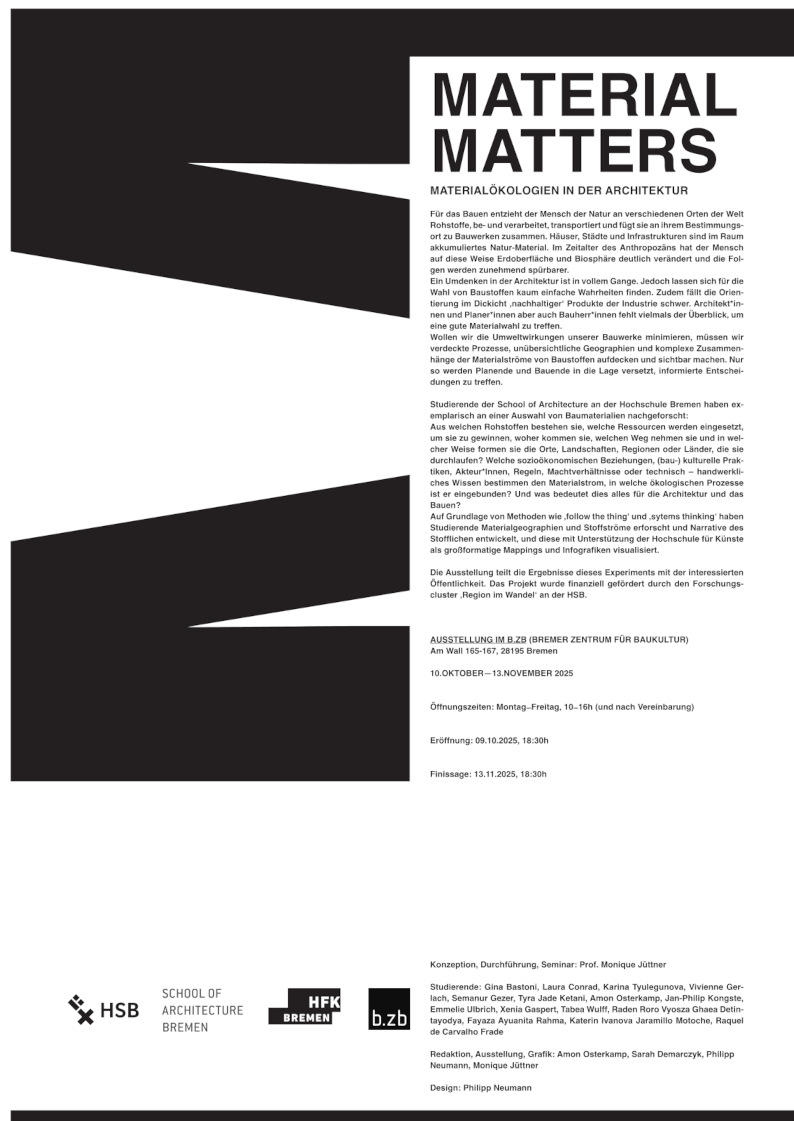 Aus welchen Rohstoffen bestehen sie, welche Ressourcen werden eingesetzt, um sie zu gewinnen, woher kommen sie, welchen Weg nehmen sie und in welcher Weise formen sie die Orte, Landschaften, Regionen oder Länder, die sie durchlaufen? Welche sozioökonomischen Beziehungen, (bau-) kulturelle Praktiken, Akteur*Innen, Regeln, Machtverhältnisse oder technisch – handwerkliches Wissen bestimmen den Materialstrom, in welche ökologischen Prozesse ist er eingebunden? Und was bedeutet dies alles für die Architektur und das Bauen?